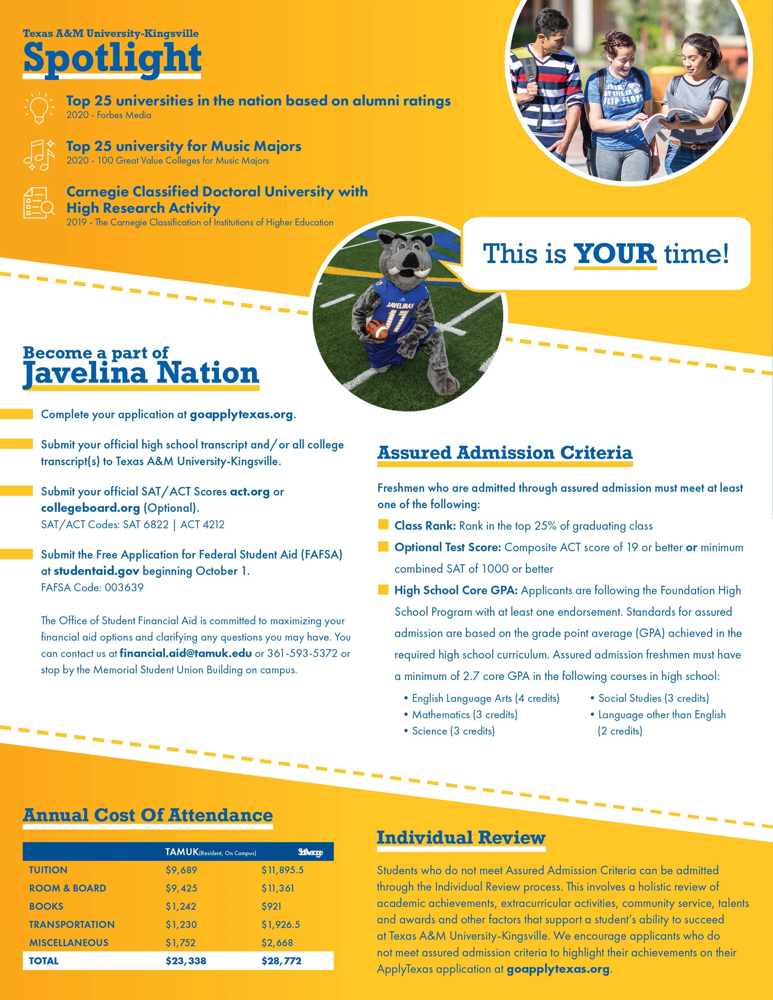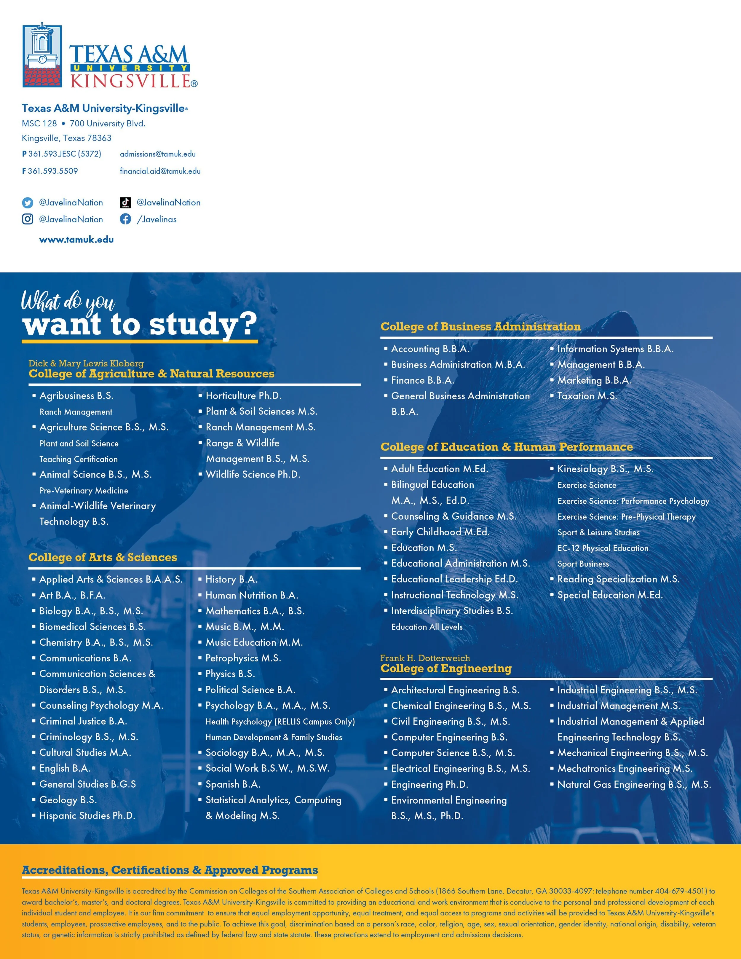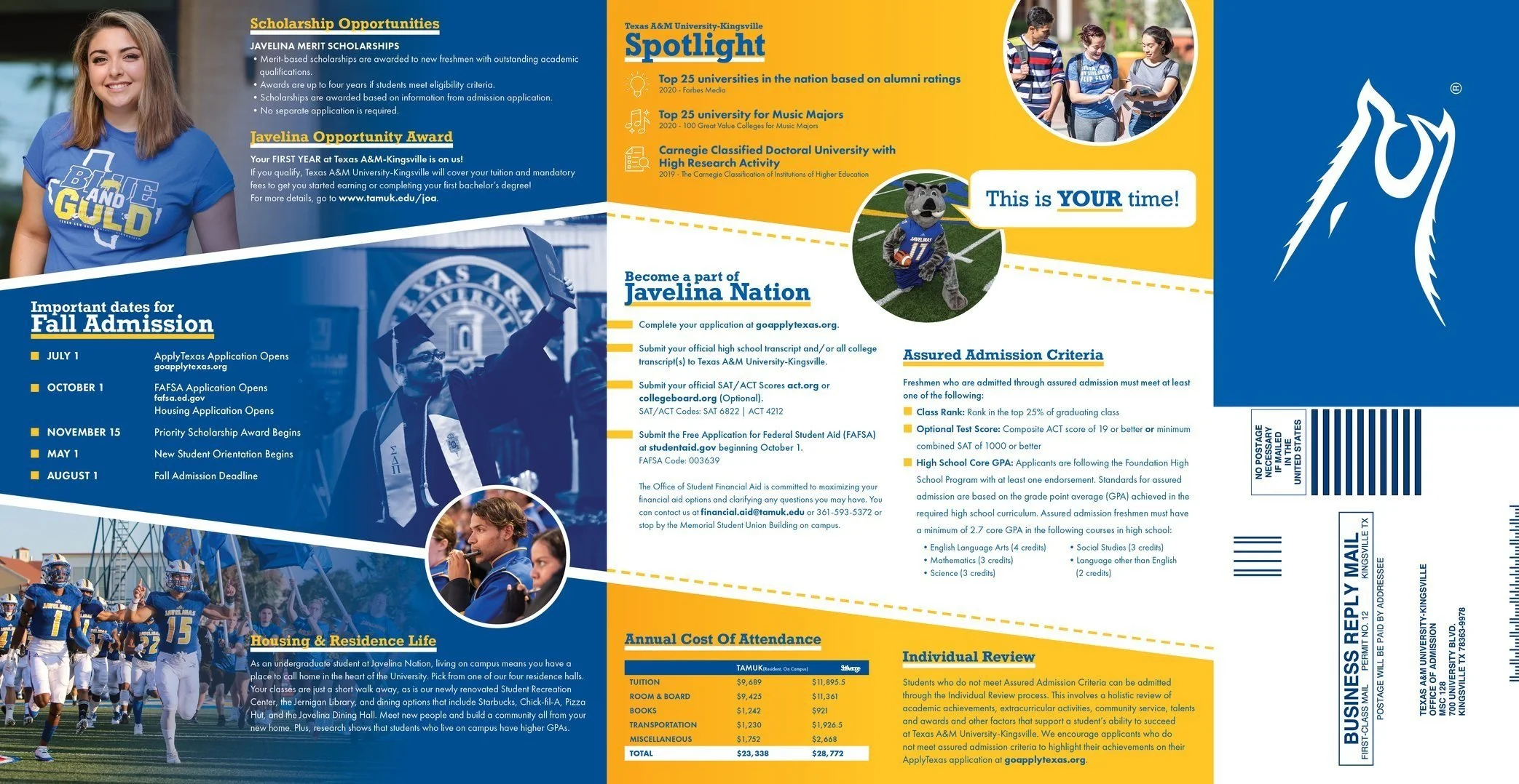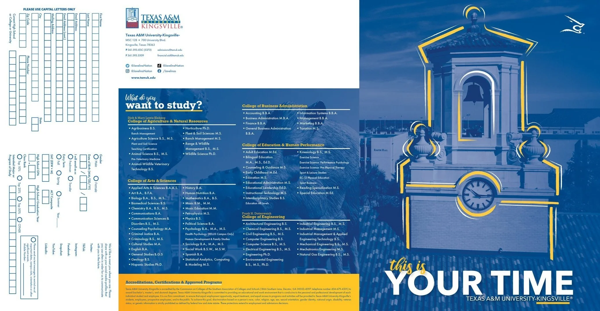 Designed search piece admissions collateral material for prospective students. Used as a recruitment tool, and to relay important information students would need in order to successfully apply to Texas A&M-Kingsville.
