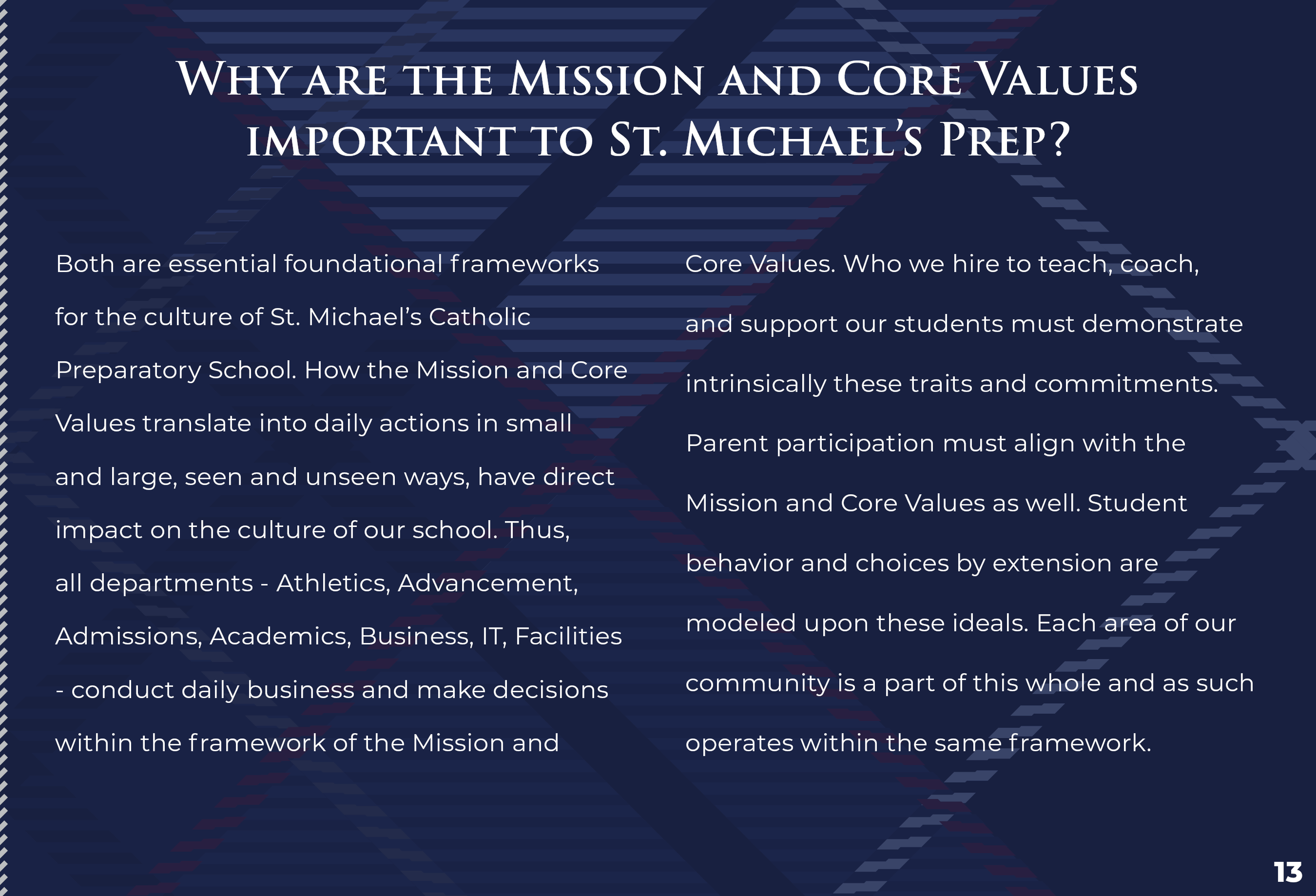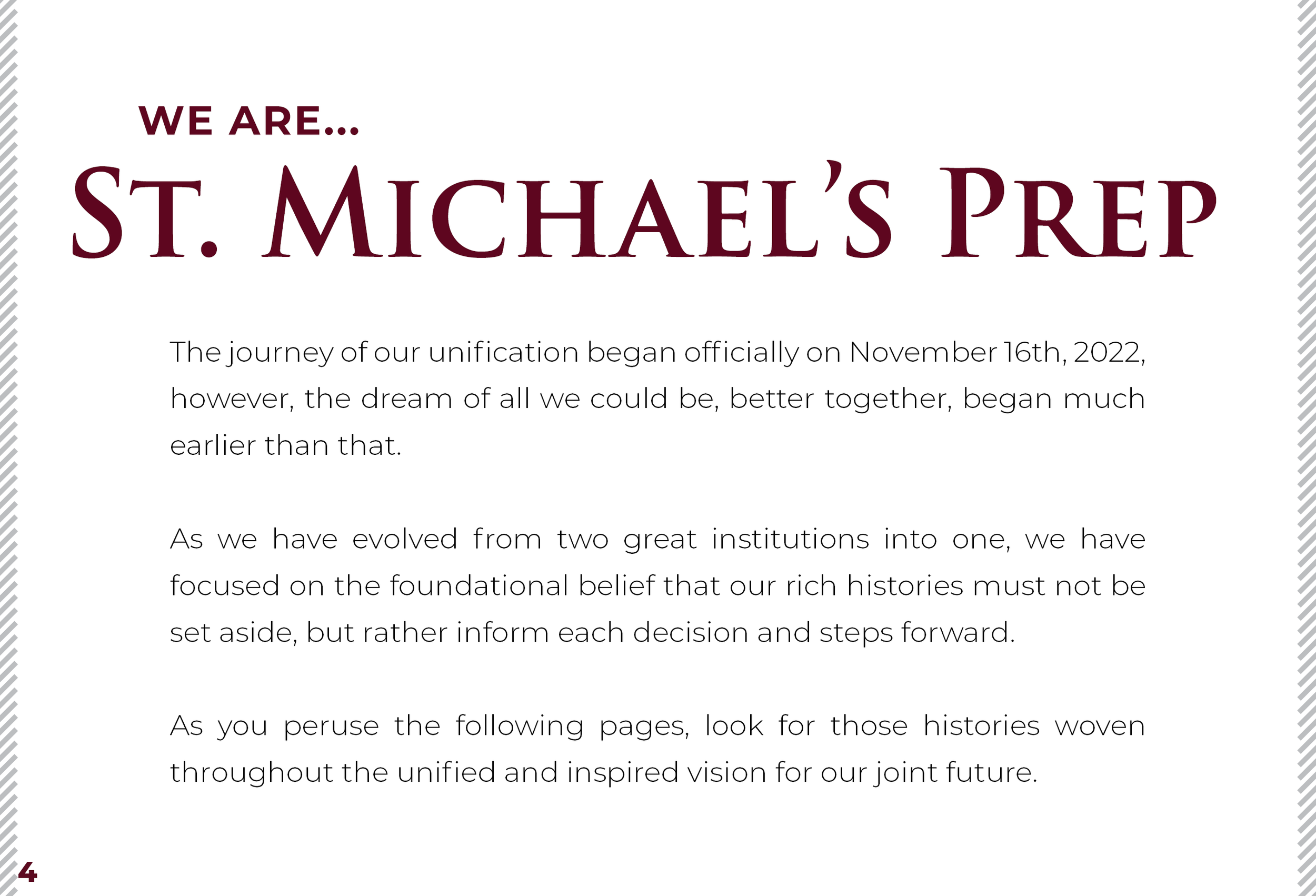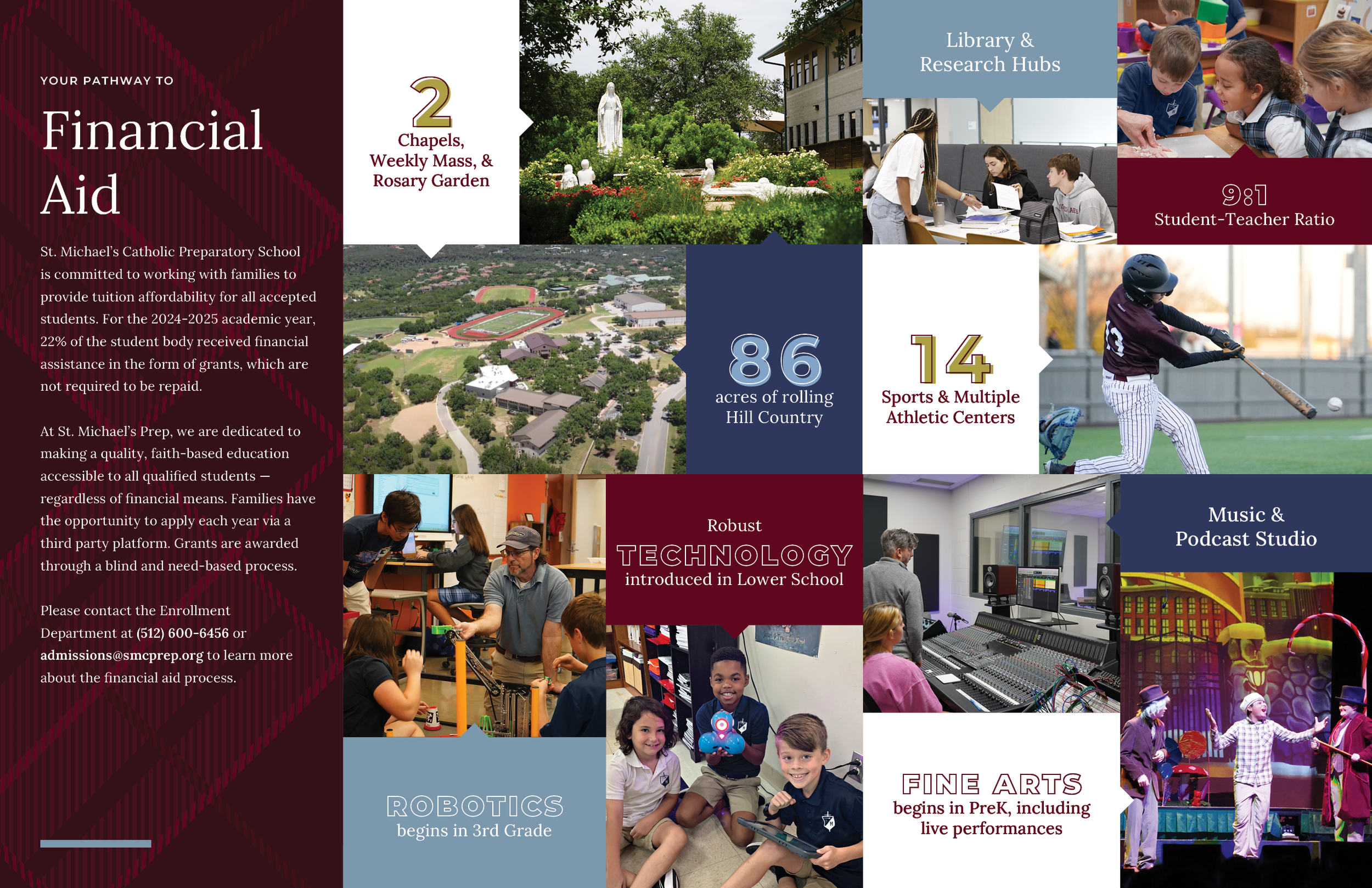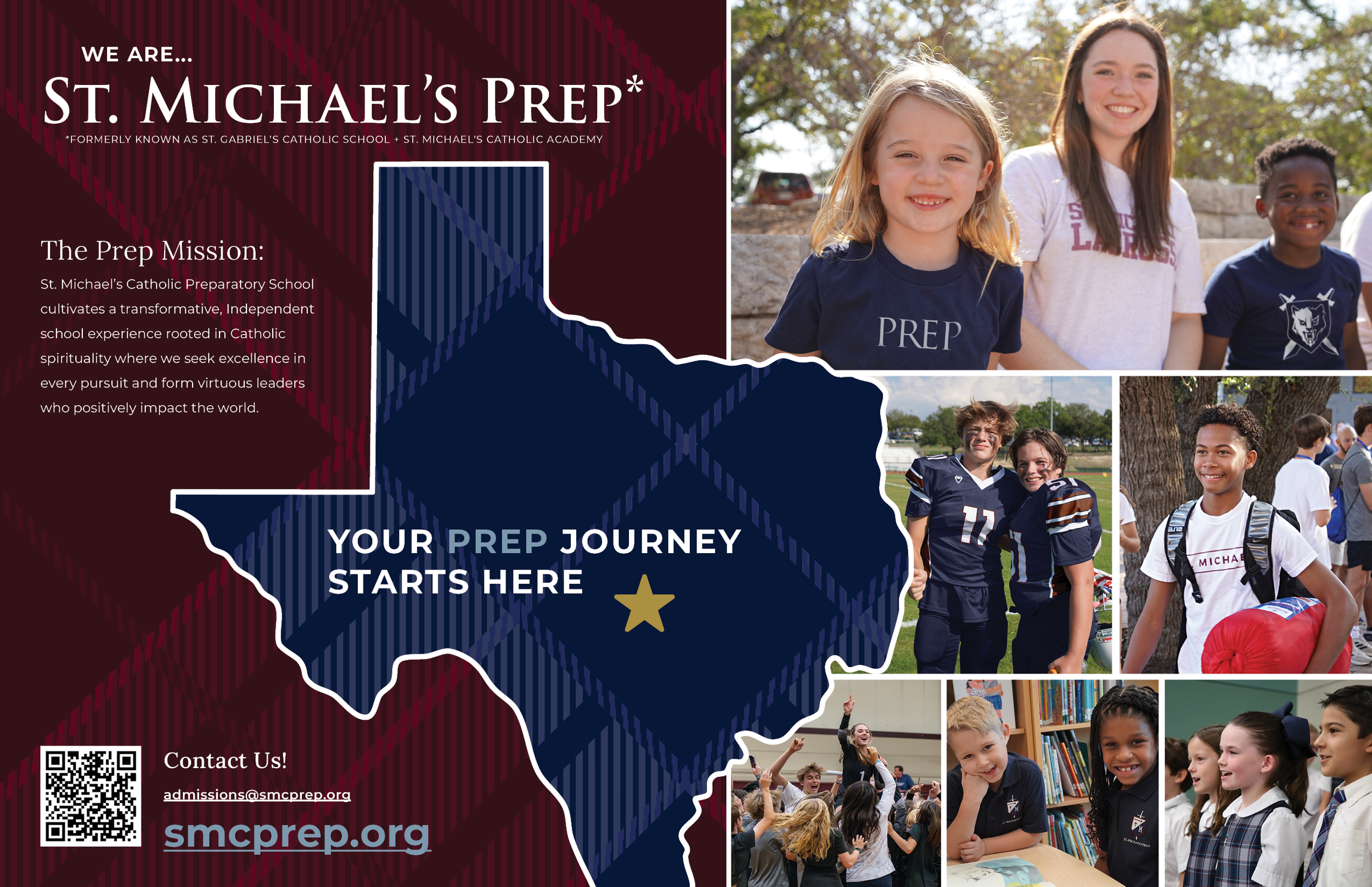 Admissions viewbook for the St. Michael’s Prep 2024-2025 school year. A couple of goals this admissions piece are: to introduce St. Michael’s Prep as a Pre-K 3 - 12th Grade Catholic School and unveil the recent unification of St. Gabriel’s Catholic School and St. Michael’s Catholic Academy to the greater Austin community.