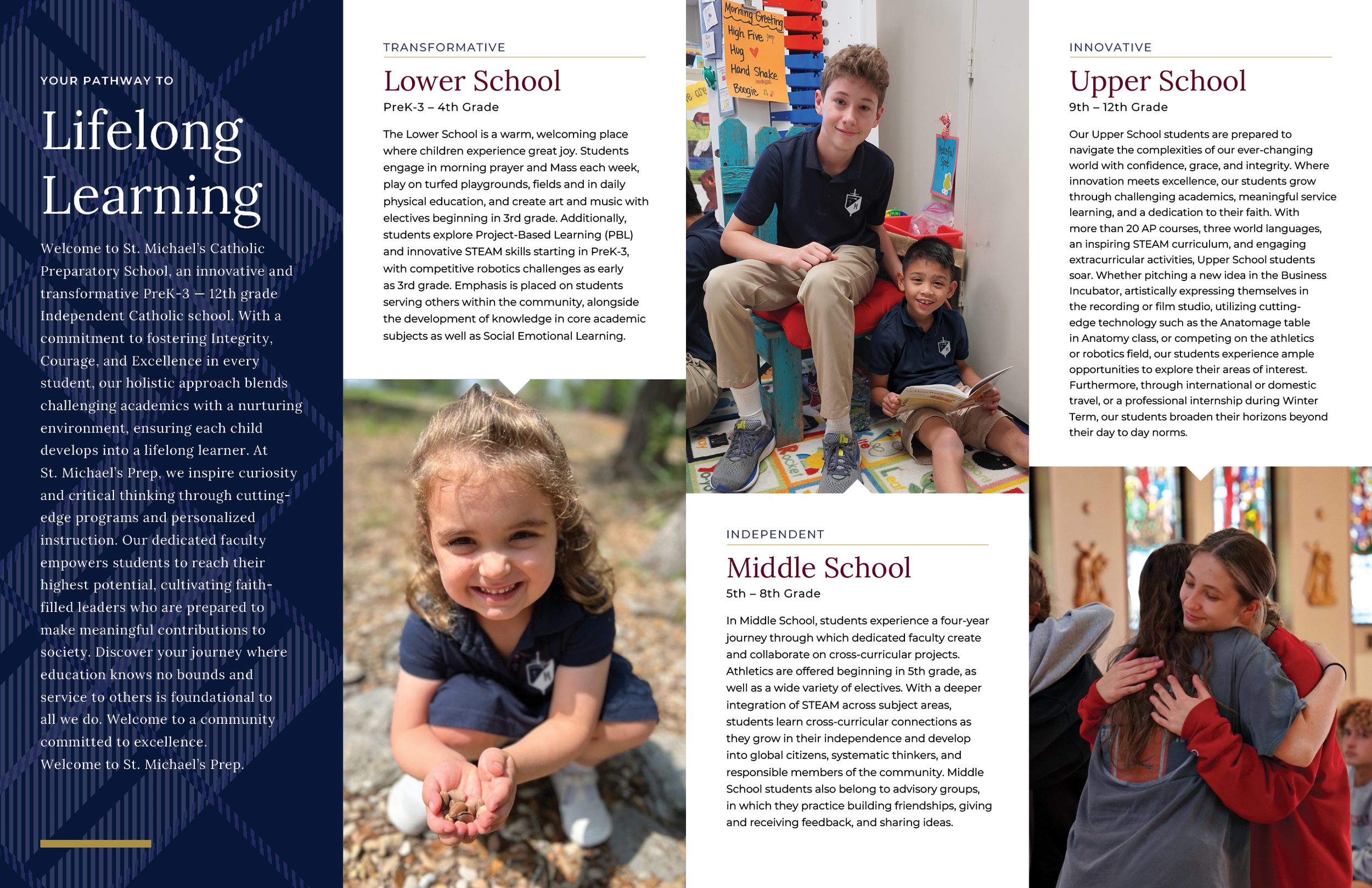 The St. Michael’s Prep look-book was a printed and digital booklet that was used to unveil St. Michael’s Prep as a Pre-K 3 - 12th Grade Catholic School to the Board of Trustees, Donors, and the St. Gabriel’s + St. Michael’s Catholic School community. The complete version of this