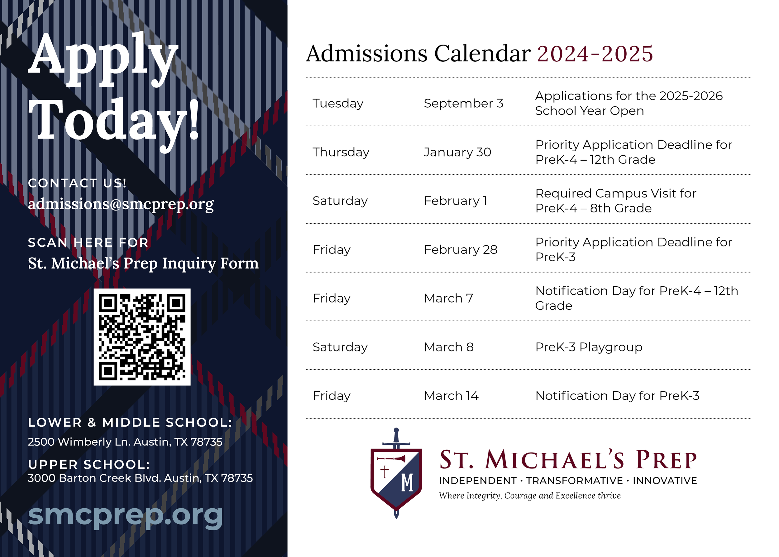 Admissions Postcard for the St. Michael’s Prep 2024-2025 school year. A couple of goals this admissions piece are: to introduce St. Michael’s Prep as a Pre-K 3 - 12th Grade Catholic School and to provide upcoming admissions event dates. These postcards are distributed to prospective families, local businesses and churches.