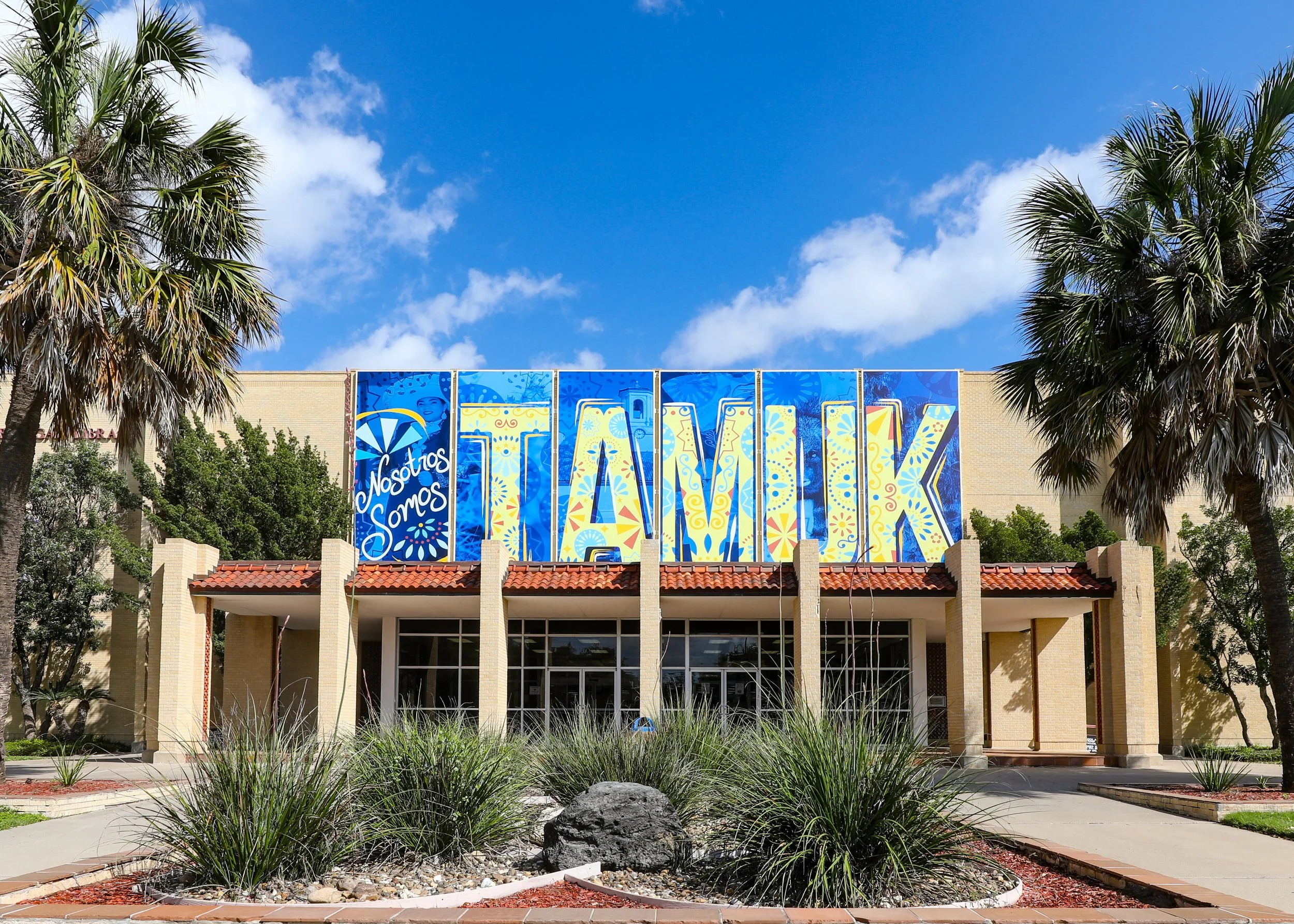 Nosotros Somos TAMUK banners hang outside the front exterior of the A&M-Kingsville library. There are six panels that make the full artwork.